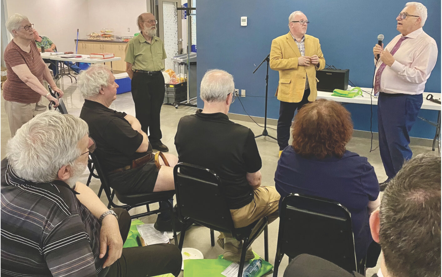 (From left) Judith O’Rourke addresses Commissioner Raymond Théberge during a 2024 public question period (O’Rourke is a Regional Association of West Quebecers (RAWQ) board member); RAWQ president David Gillespie; Charles Taker, Commissioner’s representative for Quebec and Nunavut; Commissioner of Official Languages for Canada, Raymond Théberge. Lily Ryan
