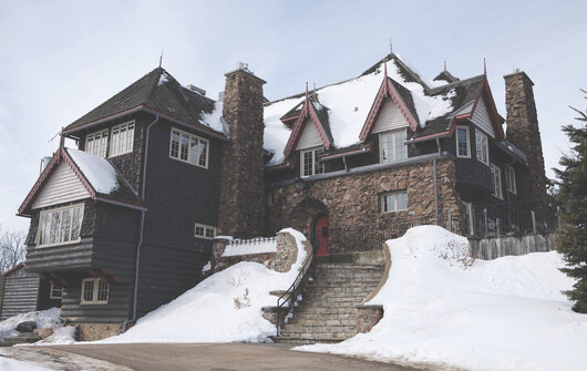 Designed by Ottawa architect Werner Noffke in the Queen Anne Revival style, the two-and-a-half storey structure features a steeply pitched cedar-shingled roof, wood siding milled to resemble logs, and a foundation, terraces and chimney of local granite. The NCC acquired the property in 1964, at a point when, the organization later described, the building was on the verge of ruin. It was designated a federal heritage building in 1984.