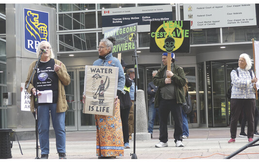 Protesters gather outside the Federal Court of Appeal in Ottawa on October 8 during hearings on the planned Chalk River nuclear waste facility, calling for stronger Indigenous consultation and water protection.