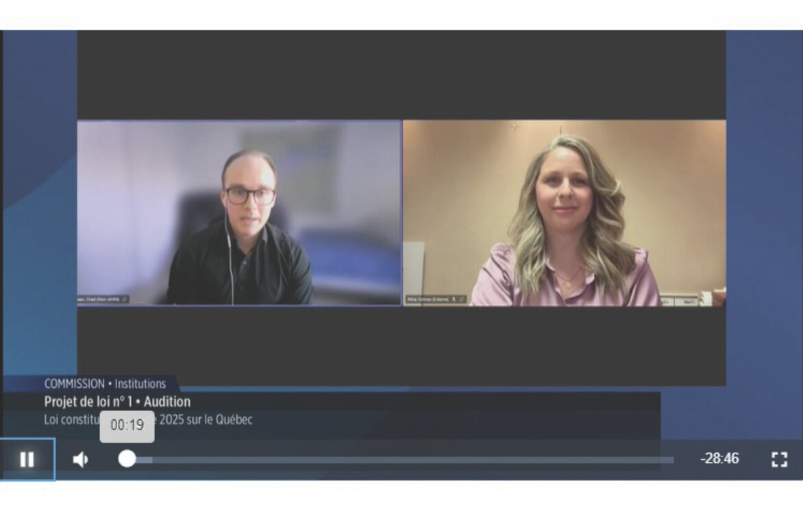 Chad Bean and Alina Seguin-Holmes of the Regional Association of West Quebecers presented to the National Assembly on February 5, urging lawmakers to amend Bill 1 to better protect individual rights, minority communities, and essential public services. Photo: Screenshot of the National Assembly of Quebec, Commission on Institutions hearing on Bill 1, February 5, 2026.